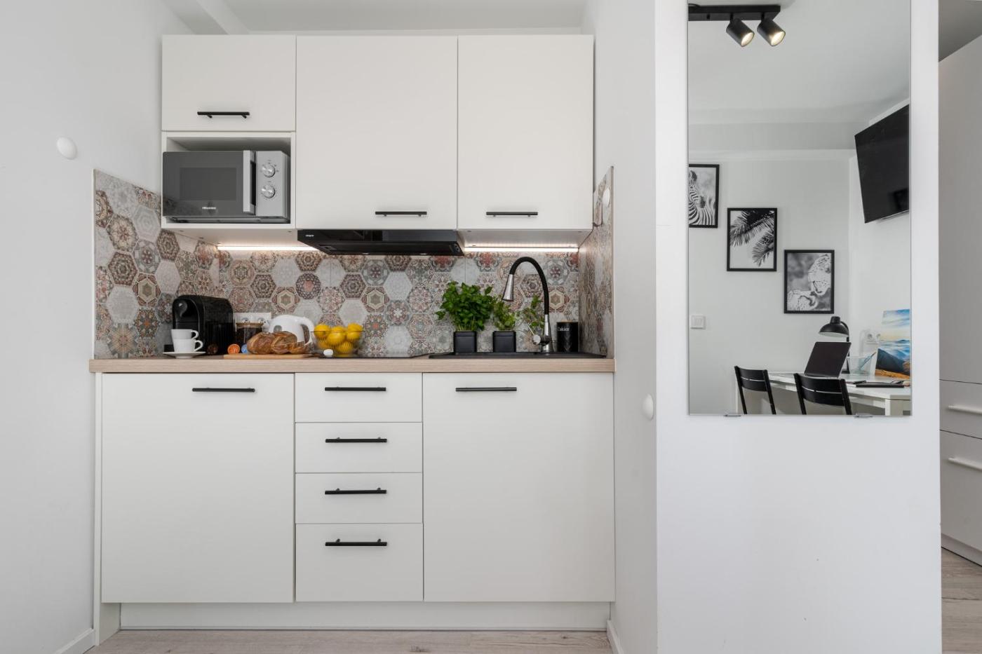 Apartament typu studio. The apartment features 1 bedroom and 1 bathroom with a shower and free toiletries. Meals can be prepared in the well-fitted kitchenette, which is fitted with a stovetop, a refrigerator, kitchenware and a microwave. The apartment offers a washing machine, a tea and coffee maker, a seating area, a flat-screen TV with streaming services, as well as city views. The unit offers 1 bed. Apartament - 2 osobowy. Powierzchnia pokoju ok.: 15 mkw.